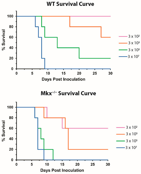 M1 macrophages are a central component of the innate immune response for both tissue repair and infection [30]. To assess whether a lack of MKX can impair systemic M1 macrophage recruitment during infection, mice were challenged with the bacteria Salmonella enterica serovar Typhimurium. Mkx−/− and WT mice were inoculated with four serial doses of S. enterica and the virulence was assessed by determination of the bacterial dose causing lethality in 50% of the exposed population (LD50). In comparing the Kaplan–Meier survival curves, it is clear that Mkx−/− mice were more susceptible to lower doses of S. enterica, than WT mice over a 17-day incubation period (Figure 4). At a dose of 102 colony forming units (CFU), 100% of WT mice were able to resolve the infection, while 40% of Mkx−/− mice succumbed. Overall, the LD50 for Mkx−/− mice was 5.3 × 102 CFU, in comparison with an LD50 of 3.7 × 104 CFU for WT mice. This is a 70-fold increase in susceptibility of Mkx−/− mice to S. enterica and suggests that Mkx is necessary for M1 macrophage recruitment in the activation of pro-inflammatory immune responses.