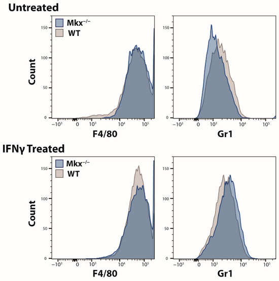 In response to injury or infection, macrophages polarize into the M1 pro-inflammatory subtype, and these cells secrete proinflammatory cytokines. We next addressed whether the diminished immune response was an intrinsic defect of proliferation and/or polarization of Mkx−/− macrophages. Bone marrow-derived cells (BMDCs) were isolated from the femurs of WT and Mkx−/− mice and tested for their ability to polarize to M1 macrophages and proliferate in culture. BMDCs were treated with IFNγ (10 ng/mL) [31] to induce polarization to the M1 pro-inflammatory subtype. After 3 days, IFNγ-treated and untreated BMDCs were analyzed using FACS to detect the macrophage differentiation marker, F4/80, and the M1 macrophage-specific surface marker, Gr1. In both treated and control cells, Mkx−/− and WT peaks overlap and the cells all express F4/80 (Figure 5). IFNγ treatment of WT and Mkx−/− BMDCs caused a shift from Gr1− to Gr1+ cells in Mkx−/− and WT cells as evidenced by the rightward shift of the peaks, indicating these cells were polarized towards the M1 subtype (Figure 5). These results indicate that Mkx does not participate in the regulation of BMDC polarization to the pro-inflammatory phenotype.