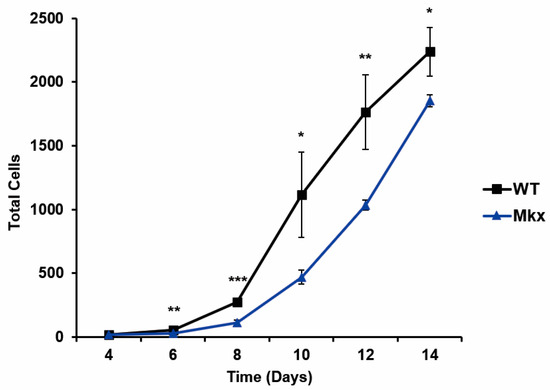 Delayed proliferation of Mkx−/− bone marrow-derived macrophages. Proliferation of WT and Mkx−/− bone marrow-derived cells over 14 days in culture was determined using Trypan blue exclusion counting. Data are mean ± SD from 3 experiments done in triplicate, * p ≤ 0.05, ** p ≤ 0.01, *** p ≤ 0.001.