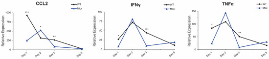 Altered inflammatory response in Mkx−/− muscle following cardiotoxin-induced injury. Mkx-deficient muscle demonstrated reduced expression of the pro-inflammatory genes, Ccl2, Ifnγ, and Tnfα. Total muscle RNA was isolated from Mkx−/− and WT cardiotoxin-injured quads and transcription levels were analyzed by RT-qPCR using ΔΔCt analysis. All samples (n = 5 at day 1, n = 9 at day 2, n = 4 at day 3, n = 3 at day 5) were normalized to WT uninjured contralateral muscle. Data are the mean ± SD of each timepoint, * p ≤ 0.05, ** p ≤ 0.01, *** p ≤ 0.001.