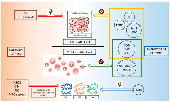 Effects of redox imbalance on keratinocytes, skin barrier proteins, and inflammation mediators (SS = disulfide; SH = thiol; PON1 = paraoxonase 1; Nrf2 = nuclear factor erythroid 2-related factor 2; HO-1 = heme oxygenase 1; SOD = superoxide dismutase; CAT = catalase; GPx = glutathione peroxidase; GSSG = oxidized glutathione; AHR = aryl hydrocarbon receptor; H2O2 = hydrogen peroxide; O22− = superoxide; NO = nitric oxide; MPO = Myeloperoxidase; AGEs = Advanced glycation end products; AOPPs = Advanced Oxidation Protein Products; FLG = filaggrin; IVL = involucrin; LOR = loricrin).