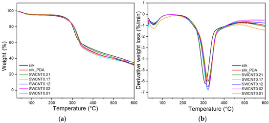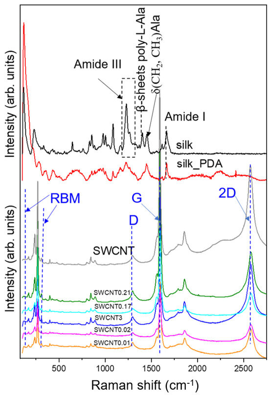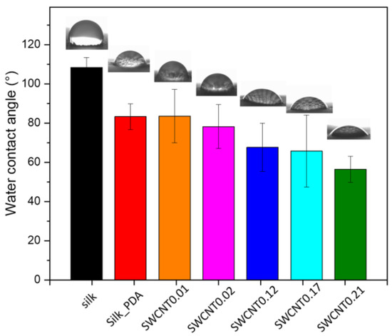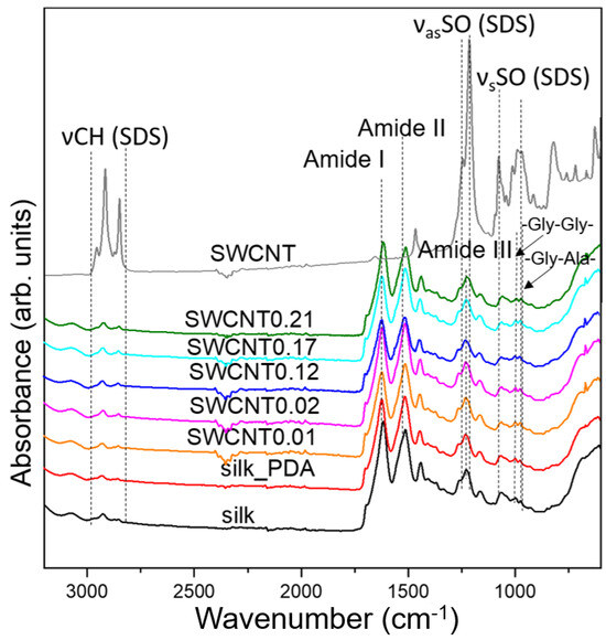 3.2. Characterization of Pure Silk Fabric and Silk Fabric Functionalized with SWCNTs