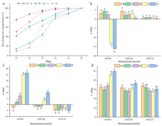 Determination of external quality of grape berries at different periods. (a) Color conversion rate of grape berries in different periods. (b) a-value of grape berries in three periods. (c) b-value of grape berries in three periods. (d) L-value of grape berries in three periods. The data are expressed as average values, and different letters indicate significant differences between treatments (p < 0.05).