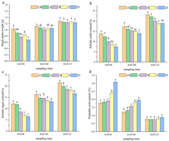 Determination of internal quality of grape berries at different periods. (a) Single-grain weight of grape berries in three periods. (b) Soluble solid content of grape berries in three periods. (c) Soluble sugar content of grape berries in three periods. (d) Titratable acid content of grape berries in three periods. The data are expressed as average values, and different letters indicate significant differences between treatments (p < 0.05).