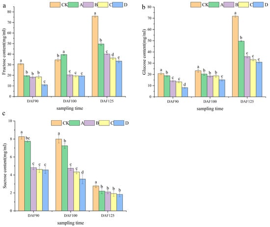 According to the sucrose content expression chart, the sucrose content of CK was higher than that of the other treatments at different time periods. Additionally, the content of DFA90 was 2.97 times higher than that of DFA125. During the entire experiment, the sucrose content exhibited a decreasing trend (Figure 3a). As depicted in the graph showing glucose content determination, the glucose content exhibited the most significant increase. During various time periods, the glucose content of CK was higher than that of the other treatments. Specifically, the content of DFA125 was 3.44 times higher than that of DFA90. During the entire process, the glucose content exhibited an upward trend (Figure 3b). The trend of fructose content change was similar to that of the glucose content (Figure 3c). This suggests that both glucose and sucrose increase during berry growth, and different treatments can reduce sugar accumulation. Furthermore, higher shading rates have a more pronounced effect on the sugar content of berries.