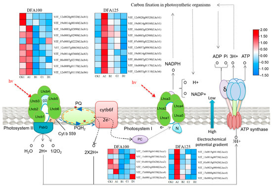 We identified changes at the gene level by comparing data from each transcriptome, and conducted GO and KEGG enrichment analyses using all reference genes as the background to comprehend the function of DEGs. The KEGG pathways, including flavonoid biosynthesis, circadian plants, stilbene compounds, diarylheptane compound and gingerol biosynthesis, photosynthetic antenna proteins, and phenylalanine metabolism, are significantly enriched in CK1 to A1, CK1 to B1, CK1 to C1, CK1 to D1, CK2 to A2, CK2 to B2, CK2 to C2 and CK2 to D2, among which the photosynthetic antenna protein biosynthesis pathway was chosen for further analysis. Photosynthesis is the process of converting light energy into chemical energy. It involves the absorption, transfer, and conversion of light energy, electron transport, photophosphorylation, and carbon assimilation. The pigment–protein complex on the photosynthetic membrane is typically divided into four components: Photosystem II (PS II), Photosystem I (PS I), the Cytb6f complex, and the ATP synthase complex. The participation of these four protein complexes completes the electron transfer process from H2O to NADP+ in the photoreaction of photosynthesis, resulting in the production of ATP and the release of O2 [28]. From Figure 4, it is indicated that upon receiving light, the light-trapping pigments in PS I and PS II regulate the efficiency of light absorption in grape berries, which subsequently affects the sugar content of grape clusters. During the DFA100 period, we identified 10 differentially expressed genes in PS II. We observed that the gene expression levels were higher under CK1, indicating a positive regulation of the absorption efficiency of light-trapping pigment. Under treatment D1, the grape cluster was affected by shading, resulting in a decrease in gene expression levels. This, in turn, reduced the efficiency of light-capturing pigments, the decomposition efficiency of water, and the speed of entering ATP synthetase. Therefore, the efficiency of carbon fixation in plant tissues decreased, leading to a reduction in sugar content in the berries. The expression trend of VIT_12s0055g01110 (Lhcb6) was the most noticeable. In PS I, we identified six differentially expressed genes. In the control CK1 treatment, the gene expression was higher and positively regulated the light-trapping pigment. Under the treatment of B1 and C1, the expression content was low, which reduced the efficiency of light harvesting, NADPH generation, and carbon fixation, wherein the substances entering carbon fixation are reduced, leading to a decrease in sugar content in grape clusters. During the DFA125 phase, the expression of the A2 processing gene was detected in PS II, which positively regulates the absorption efficiency of light-trapping pigments. In PS I, the D2 treatment had the lowest expression level. This reduces the light-absorbing efficiency of light-trapping pigments, weakens the transfer of electrons, and decreases the efficiency of water decomposition. As a result, plants have lower carbon fixation efficiency, and berries have lower sugar content. It can be concluded that inhibiting the gene expression of the photosynthesis-antenna protein pathway in grape berries after shading the grape cluster leads to a decrease in sugar content in the berries.