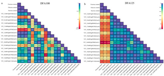 Correlation analysis of glucose, fructose, and sucrose content and 16 differential genes in grape berries. (a) Correlation between gene expression and berry sugar content at 100 days after flowering. (b) Correlation between gene expression and berry sugar content at 125 days after flowering.
