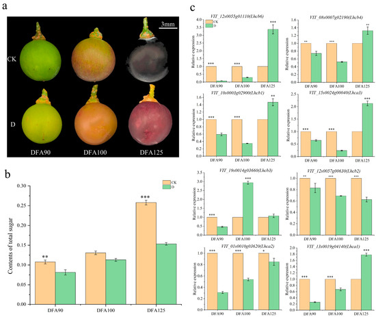 Pictures of (a) CK (control)- and D (shading)-treated grape berries at different periods. (b) Total sugar content of berries in the three periods. (c) The relative expression levels of 8 differentially expressed genes determined by real-time fluorescence quantification. All data are expressed as average ± SE. The significance level is defined as t test 0.01 ≤ p ≤ 0.05 (*), 0.001 ≤ p ≤ 0.01 (**), and p ≤ 0.001 (***), while one-way analysis of variance (ANOVA) represents p < 0.05.