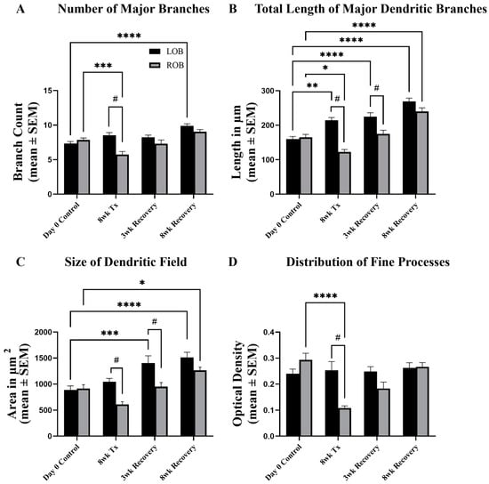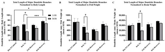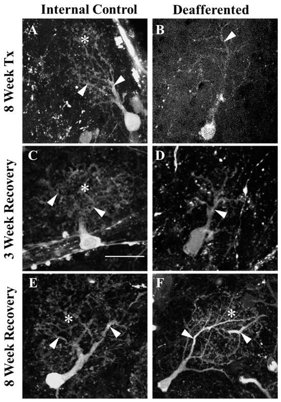 - Pozzuto, J.M.; Fuller, C.L.; Byrd-Jacobs, C.A. Deafferentation-Induced Alterations in Mitral Cell Dendritic Morphology in the Adult Zebrafish Olfactory Bulb. J. Bioenerg. Biomembr. 2019, 51, 29–40. [Google Scholar] [CrossRef] [PubMed]