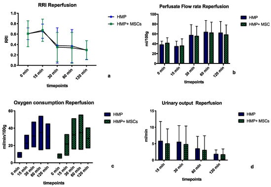 During 4 h of HMP versus HMP + MSC, we did not observe any significant differences in regard to perfusate flow rates or (intrarenal resistance indices) RRIs between the groups, as shown in Figure 2a,b. RRIs at all time points were slightly higher in the HMP + MSC group, with mean values of 0.99 ± 0.62 mmHg/mL/min in the HMP + MSC group vs. 0.82 ± 0.5 mmHg/mL/min in the HMP group (p = 0.86), and perfusate flow rates were slightly lower, at 16.97 ± 4.37mL/min/100 g in the HMP + MSC group vs. 18.21 ± 5.59 mL/min/100 g in the HMP group (p = 0.65).