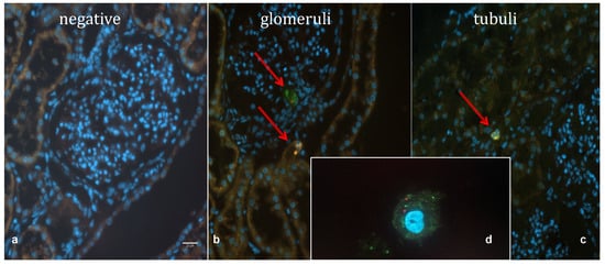 In the pHMP + MSC group, single MSCs could be traced within the glomeruli and tubules of all porcine kidneys, except from the groups in which the smallest number of MSCs, 1 × 106 cells, were infused. MSCs were detected after the HMP phase, as well as after the reperfusion phase. Figure 5 shows photographs of microscopic images taken using widefield microscopy, with a negative control (Figure 5a), cells within the glomeruli (Figure 5b) and within the tubuli (Figure 5c).