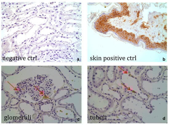 Immunohistochemical staining of porcine samples against human major histocompatibility (MHC) class 1 (MHC-1) confirmed the presence of MSCs within porcine kidneys, both after the HMP phase and in the reperfusion phase. Figure 6 shows photographs of histology slides after immunohistochemical staining and counterstaining with PAS at a 20× magnification. Figure 6a shows the section of a kidney in the HMP group as a negative control. Figure 6b shows a human skin sample, which is known to contain high amounts of MHC-1, stained in brown. Brown-stained human MSCs were detected within the glomeruli (Figure 6c arrows), as well as within tubuli (Figure 6d) of porcine kidneys. Immunohistochemical staining revealed that delivered cells seem to not just be stuck within the organs, but, in the case of the tubules, they are integrated into the endothelium, as shown in Figure 6d (arrows).