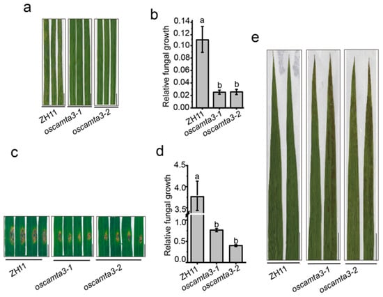 Oscamta3 exhibited increased resistance to M. oryzae. (a) Fifteen-day-old ZH11 and oscamta3 seedlings inoculated with M. oryzae by spraying. Images were taken at 5 days post inoculation (dpi). Bar = 1 cm. (b) Fungal biomass of spraying-inoculated leaves was measured to quantify relative fungal growth in ZH11 and oscamta3. Data are presented as the means ± SEs (n = 3). Lowercase letters indicate statistically significant differences (p < 0.05; one-way ANOVA). (c) Twenty-five-day-old ZH11 and oscamta3 seedlings inoculated with M. oryzae by punch inoculation. Images were taken at 7 dpi. Bar = 1 cm. (d) Fungal biomass of punch-inoculated leaves was measured to quantify relative fungal growth in ZH11 and oscamta3. Data are presented as the means ± SEs (n = 3). Lowercase letters indicate statistically significant differences (p < 0.05; one-way ANOVA). (e) Oscamta3 showed obvious lesion-mimic cell death at the heading stage. Bar = 1 cm.
