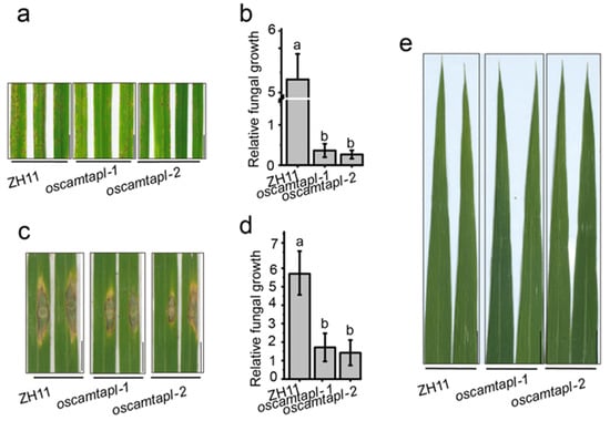 Oscamtapl exhibited increased resistance to M. oryzae. (a) Fifteen-day-old ZH11 and oscamtapl seedlings inoculated with M. oryzae Zhong1 by spraying. Images were taken at 5 dpi. Bar = 1 cm. (b) Fungal biomass of spraying-inoculated leaves was measured to quantify relative fungal growth in ZH11 and oscamtapl. Data are presented as the means ± SEs (n = 3). Lowercase letters indicate statistically significant differences (p < 0.05; one-way ANOVA). (c) Twenty-five-day-old ZH11 and oscamtapl seedlings inoculated with M. oryzae Zhong1 by punch inoculation. Images were taken at 7 dpi. Bar = 1 cm. (d) Fungal biomass of punch-inoculated leaves was measured to quantify relative fungal growth in ZH11 and oscamtapl. Data are presented as the means ± SEs (n = 3). Lowercase letters indicate statistically significant differences (p < 0.05; one-way ANOVA). (e) Oscamtapl did not show an obvious hypersensitive response at the heading stage. Bar = 1 cm.