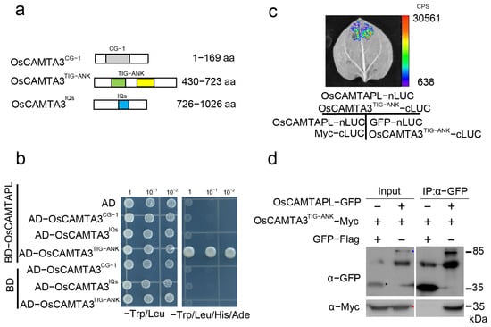 The coding sequence of OsCAMTAPL was cloned and inserted into a pGBKT7 vector. The coding sequence of OsCAMTA3 was divided, cloned, and inserted into the bait vector pGADT7. The appropriate pairs of constructs were transformed into yeast strain AH109. The yeast clones were grown on synthetic defined (SD) medium lacking Trp and Leu (SD-Trp-Leu) at 30 °C for 2 days and then spotted onto SD medium lacking Trp, Leu, His, and Ade (SD-Trp-Leu-His-Ade) to detect interactions.