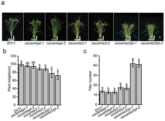Morphology of ZH11 and oscamtas plants at the heading stage. (a) Phenotypes of ZH11 and oscamtas plants at the heading stage. Bars = 10 cm. (b,c) Comparison of plant height and tiller number between ZH11 and oscamtas plants. Data are presented as the means ± SE (n = 10). Lowercase letters indicate statistically significant differences (p < 0.05; one-way ANOVA).