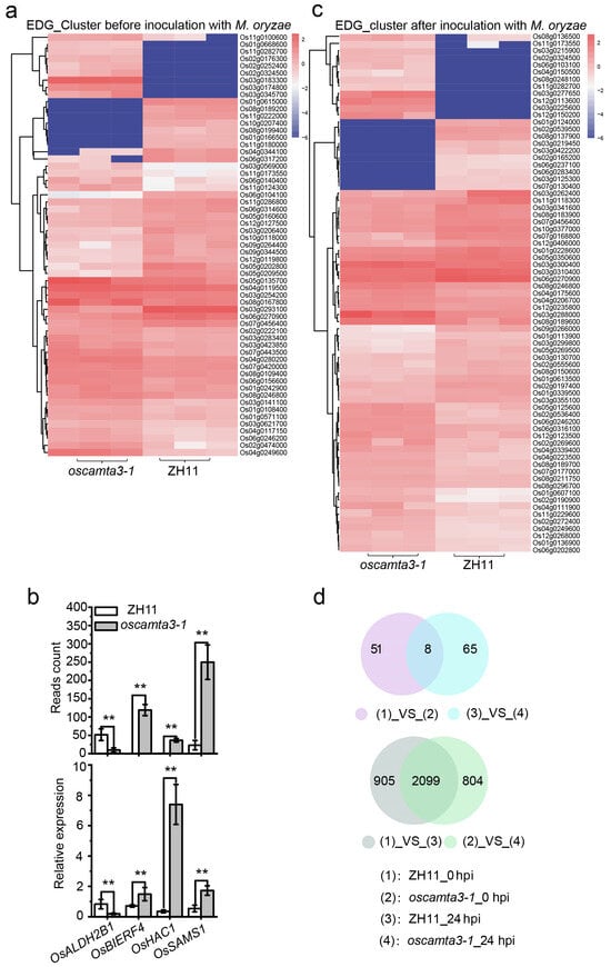 Identification of DEGs in ZH11 and oscamta3-1 by RNA-seq. (a) The number of DEGs between ZH11 and oscamta3-1 before inoculation with M. oryzae. (b) OsALDH2B1, OsBIERF1, OsHAC1, and OsSAMS1 were chosen to verify the RNA-Seq results by qRT-PCR. Data are presented as the means ± SEs (n = 3). (**; p < 0.01; Student’s t-test). (c) The number of DEGs between ZH11 and oscamta3-1 after inoculation with M. oryzae. (d) Venn diagrams showing the number of EDGs before or after inoculation with M. oryzae.