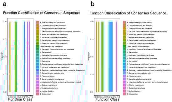 Identification of the function of DEGs in ZH11 and oscamta3-1. (a) Functional classification of consensus sequence term enrichment analysis of all DEGs before inoculation with M. oryzae. (b) Functional classification of consensus sequence term enrichment analysis of all DEGs after inoculation with M. oryzae.
