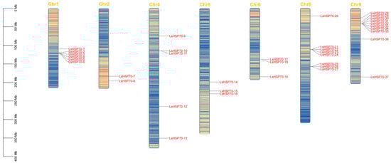 Chromosome localization of LsHSP70. The top yellow text represents the number of chromosomes, the red text represents the gene name, and the scale on the left represents the chromosome size.