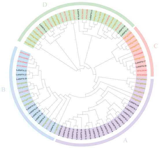 The phylogenetic tree was constructed by HSP70 from Arabidopsis thaliana, rice, and lettuce (Figure 2). LsHSP70 are categorized into four groups: A, B, C, and D. Group A had the highest number of 21 LsHSP70 genes, while group C contained only LsHSP70-17 and LsHSP70-18, and groups B and D had nine and five LsHSP70 genes each. In addition, there were no AtHSP70 genes in group C, and the OsHSP70 genes were also distant from the LsHSP70 genes, which may indicate that this class of LsHSP70 genes was distantly related to the HSP70 genes of Arabidopsis and rice.