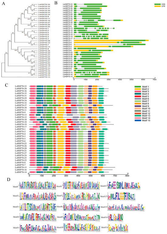 Gene structure of LsHSP70 and motif analysis. (A) LsHSP70 evolutionary tree; (B) gene structure; (C) motif distribution; (D) motif pattern. Figure 3D represents the sequence identity of the motif. Different colors correspond to different motifs, and different letter sizes represent different frequency matrices.