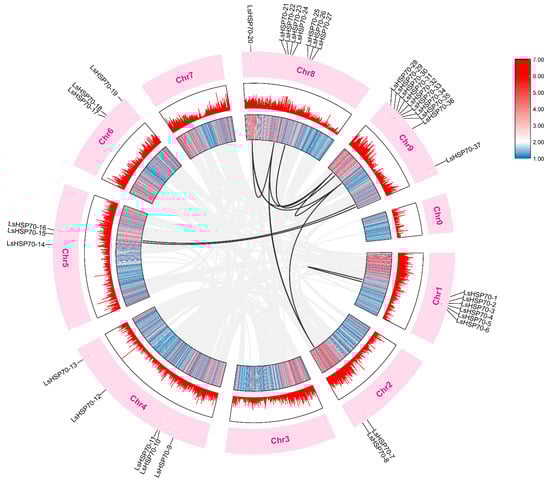 Collinearity analysis of LsHSP70 gene family. The gray lines in the background represent homogenous pairs in the entire lettuce genome, and the black lines represent homogenous pairs in the LsHSP70. The information represented by each circle in the figure from the inside out was the genome density heat map, genome density linear map, chromosome name, and LsHSP70 chromosome location labeling.