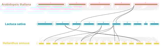 Collinearity analysis of lettuce with Arabidopsis and sunflower. The gray line in the background represents all collinear pairs of lettuce with Arabidopsis and sunflower at the genome level. The black line represents a common pair of HSP70 family members belonging to the three species.