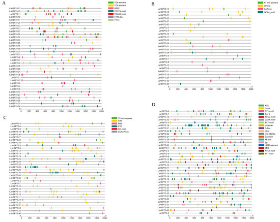 Cis-acting elements play an important role in gene regulation and expression within promoter regions, and well-regulated promoter cis-acting elements are urgently needed for transgenic plant engineering to achieve controlled expression levels of target genes [29]. An analysis of promoter cis-acting elements of the 37 LsHSP70 genes revealed that phytohormone-responsive and light-responsive elements were the most abundant. A majority of these LsHSP70-responsive elements were associated with ABA, MeJA, and an anaerobic environment. ABRE plays an important role in signaling, ABA activation, and resistance in Arabidopsis [30]. The cis-acting elements indicate that the LsHSP70 gene family plays a key role in responding to different environmental changes such as phytohormones, drought, heat, and light.