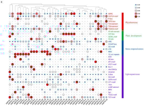 LsHSP70 promoter analysis. Location map of cis-acting elements related to plant hormones (A), plant development (B), stress response (C), and light response (D). (E) Heat map of the number of instantaneous cis-acting components.