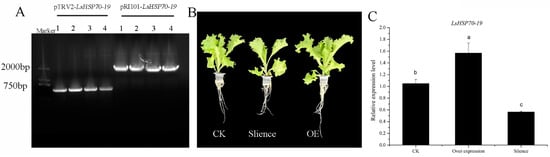 The role of LsHSP70-19 gene on lettuce heat tolerance was further explored. The gene for silencing as well as overexpression was analyzed (Figure 8). We cloned 543 bp and full-length fragments from the CDS region of LsHSP70-19 into pTRV2 and pRI101 vectors, respectively. After Agrobacterium was mediated and validated, the constructs pTRV2-LsHSP70-19 and pRI101-LsHSP70-19 were successfully transferred into lettuce and expressed.