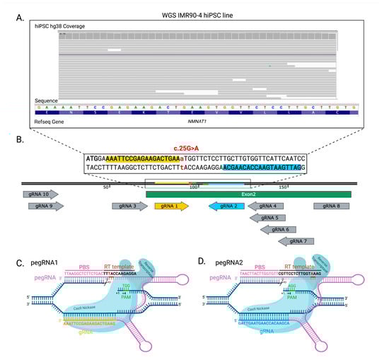 PE3 prime editing strategy to generate the isogenic model for an NMNAT1 c.25G>A (p.V9M) mutation. (A). WGS analysis of the genome of the hiPSC line IMR90-clone 4 depicts no variants in the region of interest for NMNAT1 editing compared to the reference human genome hg38. (B). Two gRNAs out of ten were selected for molecular cloning based on the distance to the desired edit position (C). pegRNA1 and (D). pegRNA2 anneal to the complementary DNA strand. Cas9 Nickase nicks the opposite strand, allowing for PBS annealing and reverse transcription along the RT template that incorporates the desired single nucleotide edit (red letter).