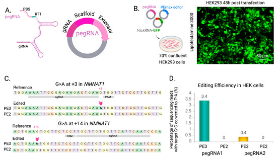 Validation of PE in HEK-293T cells. (A). Each pegRNA has 3 key components: a gRNA or spacer, a scaffold, and an extension with the PBS and the RTT sequence, which introduces the desired edit. (B). Confluent HEK cells were co-transfected using Lipofectamine 3000 with the pegRNA, the PEmax editor, and a nicking guide plasmid harboring a reporter EGFP cassette. Then, 48 h post-transfection, approximately 80–90% of the HEK cells expressed GFP. Scale bar = 50 μm. (C). Three days after plasmid delivery, genomic DNA was extracted, and PE was analyzed by NGS. pegRNA1 was designed to introduce a G>A edit at +3 position from the nicking site in NMNAT1, and pegRNA2 was designed to introduce the same edit at +14 position from the nicking site. (D). Editing efficiencies were determined by NGS and expressed as the percentage of alleles with G•C target converted to T•A. NGS showed editing only occurred with PE3 with low efficiency: 3.40% for pegRNA1 and 0.42% for peg RNA2.