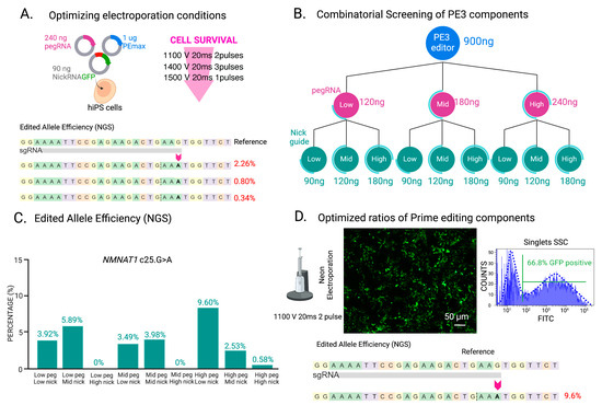Optimization of PE of hiPSCs for NMNAT1 c.25G>A. (A). Optimization of electroporation conditions for the efficient delivery of PE components in the cells using 1 μg of PEmax editor, 90 ng of nicking guide RNA, and 240 ng of pegRNA1. Three different electroporation parameters were tested. The best condition was 1100 V, 20 ms, and 2 pulses, resulting in the highest cell survival and the highest percentage of edited alleles detected by next-generation sequencing (NGS). (B). Combinatorial screening of different concentrations of PE components. Using the optimal electroporation parameters, a total of 9 different combinations of PE components were assessed to optimize PE efficiency. PEmax was set at 900 ng, and three doses of pegRNA (low, 120 ng; medium (mid), 180 ng; and high, 240 ng) and three doses of nicking guide RNA (low, 90 ng; medium (mid), 120 ng; and high 180 ng) were included. (C). NGS analysis of the bulk electroporated hiPSCs showed the maximum editing efficiency (9.60%) was achieved with high pegRNA1 and low nicking gRNA. (D). PE efficiency under optimized conditions demonstrated a substantial increase in the percentage of GFP-positive cells (66.80%) post-electroporation that translated into a notable increase in editing efficiency. Scale bar = 50 μm.