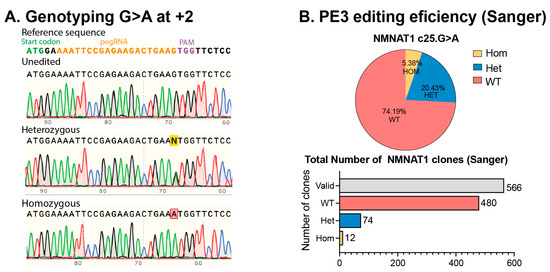 Generation of NMNAT1V9M/V9M isogenic clones. (A). Genotype confirmation and (B). determination of the PE efficiency for NMNAT1 c.25 G>A using Sanger sequencing. PE3 efficiency accounted for over 25.00% of edited clones. Data in (A) are representative of n ≥ 2 independent replicates.