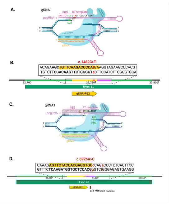 Prime editing strategy to generate the isogenic model for PRPF3 c.1482C>T (p.T494M) mutation and for PRPF8 c.6926A>C (p.H2309P) mutation. (A). The gRNA1 anneals with the complementary DNA strand. Cas9 Nickase nicks the PAM-containing strand of the target DNA. The PBS anneals with the PAM-containing strand, and RTase extends the 3′ end using the RT template. (B). pegRNA was selected for molecular cloning based on the distance to the mutation and sequence length. (C). The gRNA1 anneals with the complementary DNA strand. Cas9 Nickase nicks the PAM-containing strand of the target DNA. The PBS anneals with the PAM-containing strand, and RTase extends the 3′ end using the RT template. (D). pegRNA was selected for molecular cloning based on the distance to the mutation and sequence length.