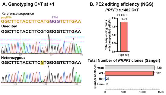 Generation of PRPF3 isogenic clones. (A). Genotype confirmation and (B). determination of the PE efficiency with high pegRNA for PRPF3 c.1482 C>T (p.T494M) using NGS and Sanger sequencing. Data in (A) are representative of n ≥ 2 independent replicates.