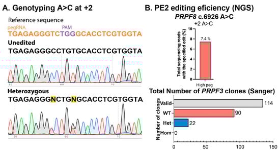 Generation of PRPF8 isogenic clones. (A). Genotype confirmation and (B). determination of the PE efficiency with high and maximal pegRNAs for PRPF8 c.6926 A>C (p.H2309P) using NGS and Sanger sequencing. Data in (A) are representative of n ≥ 2 independent replicates.