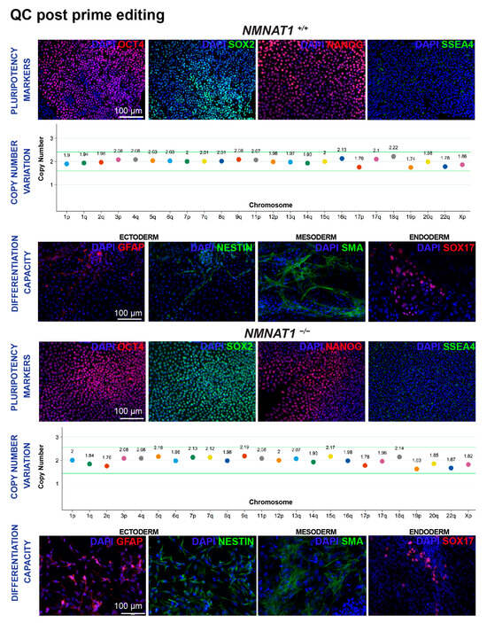 Characterization of hiPSC wild-type NMNAT1+/+, and homozygous NMNAT1−/− clones showing immunofluorescence (IF) images of SOX2+, SSEA4+, OCT+, and NANOG+ cells for pluripotency markers; embryoid bodies exhibiting NESTIN+ and GFAP+ (ectoderm), SMA+ (mesoderm), and SOX17+ (endoderm) for germ layer makers; and chromosomal copy number variation analysis. Representative images from n > 5. Scale bar = 100 μm.
