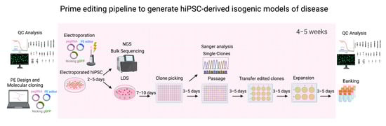 Prime editing (PE) pipeline. Our PE pipeline includes the in silico design of the pegRNA components and molecular cloning to ensemble the pegRNAs, the nicking, and the PEmax editor plasmids. We also performed a full QC analysis of the hiPSC lines prior to editing, including evaluating pluripotency and chromosomal abnormalities and assessing the differentiation capacity. Electroporation with different combinations of PE components was performed on highly confluent cultures to generate isogenic models for the NMNAT1, PRPF3, and PRPF8 mutations. After 2–5 days, electroporated hiPSC lines were dissociated into single cells and passaged at low-density seeding (LDS). In parallel, NGS was performed to confirm editing has occurred in the bulk cultures and estimate the number of clones that need to be recovered from the LDS cultures. Single colonies from LDS cultures were manually dissected and passaged by mechanical disruption into 96-well plates, where the desired edit was confirmed through Sanger sequencing analysis. Confirmed edited clones were expanded first to 12-well plates and then to 6-well plates for banking. Cryopreserved seed and master banks were obtained in parallel to the QC analysis of the selected clones.