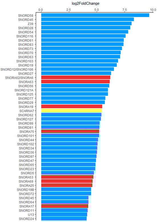 List of the 50 most upregulated snoRNAs, ranked by their log2Fold Change values. Colours indicate the classification of upregulated snoRNAs into specific types: C/D box snoRNAs (SNORD)—blue, H/ACA box snoRNAs (SNORA)—red, and SCARNAs—yellow.