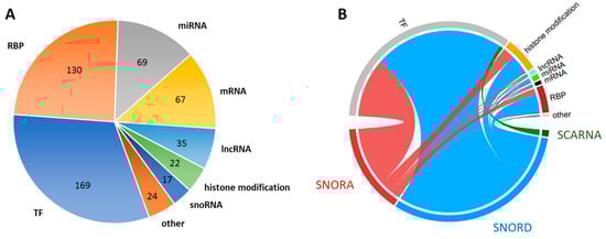 Graphical representation of snoRNA interactions: (A). Main categories of predicted interactors for dysregulated snoRNAs. Groups of interactors within each category are marked with colours: transcription factors (TF)—blue, RNA-binding proteins (RBP)—orange, microRNAs (miRNA)—grey, messenger RNAs (mRNA)—yellow, long non-coding RNAs (lncRNA)—light blue, histone modifications—green, snoRNAs—dark blue, and others—dark orange. (B). A circus plot illustrating the proportion of predicted interactions between various types of snoRNAs and the main categories of interactors. The width of the lines connecting the two halves of the plot represents the number of interactions. In the lower half of the plot, specific types of snoRNAs are indicated by distinct colours: SNORA—red, SNORD—blue, and SCARNA—green. In the upper half of the plot, the main categories of interactors are represented by the following colours: transcription factors (TF)—grey, histone modifications—orange, long non-coding RNAs (lncRNA)—light blue, microRNAs (miRNA)—light green, messenger RNAs (mRNA)—black, RNA-binding proteins (RBP)—dark red, and others—pink.