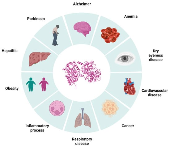 Oxidative stress arises from an imbalance between the production of reactive oxygen species (ROS) and the body’s ability to neutralize their harmful effects. At the cellular level, the impacts of oxidative stress can manifest in various alterations, including lipid peroxidation in membranes, protein misfolding or processing, and the induction of DNA mutations [36,37]. These molecular modifications, in turn, are associated with the development of various diseases (Figure 4), including neurodegenerative disorders, cardiovascular diseases, cancer, inflammatory diseases, and metabolic syndrome [38,39]. Lactoferrin has demonstrated significant potential in mitigating oxidative stress in various biological systems [40].