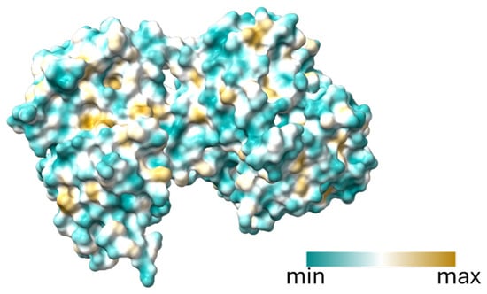 Lactoferrin (Lf) constitutes a non-heme iron-binding glycoprotein within the transferrin family that is widely distributed throughout the body [9]. It is produced mainly in milk and colostrum (1 g/L and 7 g/L, respectively) and is secreted in practically all body fluids [10]. A fraction called serum lactoferrin is present in the secondary granules of neutrophils, which, in response to inflammatory stimuli, degranulate, thus releasing lactoferrin into the bloodstream, which can reach a concentration of 200 μg/mL [11]. Lactoferrin has an approximate molecular weight of 80 kDa and comprises a single polypeptide chain of about 700 amino acids, with certain variations depending on the species [12]. Its structure is organized into two similar globular lobes, known as N-terminal (amino acids 1–222) and C-terminal (amino acids 344–703), joined by a hinge region containing an alpha helix structure between amino acids 333–343, which gives flexibility to the molecule [13]. These lobes present a combination of alpha helix structures and beta-folded sheets, forming two domains for each of these lobes. Each lobe is capable of binding Fe2+ or Fe3+ atoms in cooperation with the carbonate ion. Also, it has been reported that Lf can bind to Cu2+, Zn2+, and Mn2+ ions [14]. On the other hand, an important characteristic of lactoferrin, which may impact some of its functions, is its glycosylated structure. Human Lf has three potential N-glycosylation sites, while bovine Lf has five potential N-glycosylation sites; therefore, glycan diversity is considered one of the factors underlying the differences in the biological properties of lactoferrins [15]. The glycans in the lactoferrin show high binding affinity to a diverse array of cell receptors, in either immune cells or other cells. A family of lectins, including the scavenger receptor C-type lectin (SR-CL) on endothelial cells, DC-SIGN on antigen-presenting cells, hepatic lectin 1 on hepatocytes, Siglec-1 (CD169) on macrophages, and Toll-like receptor 4 (TLR-4) on immune cells, recognizes the glycosidic fraction of lactoferrin (bovine or human) between these receptors. These interactions enable lactoferrin to play key roles in modulating inflammation and defending against pathogens [16,17]. On the other hand, several receptors interact with lactoferrin domains, including intelectin-1 on enterocytes and eosinophils, as well as nucleolin located on the surface of dividing cells. In addition, lactoferrin binds to the low-density lipoprotein-related receptor (LRP1) on monocytes. Other relevant molecular targets include CD14, CD206, and CXCR4, which play key roles in processes such as regulation of the immune system and cell migration [18]. Binding of lactoferrin to these receptors not only facilitates its endocytosis but also activates several signaling pathways, such as mitogen-activated protein kinase (MAPK), which plays a critical role in cell proliferation, differentiation, and survival. These interactions are fundamental for the function of the innate and adaptive immune systems, neuroprotection, and iron metabolism, highlighting the versatility and biological relevance of lactoferrin in multiple physiological processes [16]. Another property that influences lactoferrin’s interactions with receptors is its hydrophobicity (Figure 2), which affects the interaction of the immune system and the nervous system. Such interactions are vital for their role in modulating immune responses and promoting cell signaling [19].