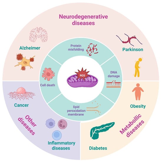 ROS-mediated cellular damage and its implications in important chronic diseases. Although the presence of reactive oxygen species (ROS) is essential for regulating homeostasis in the body, their excessive accumulation can initially trigger damage to organelles and macromolecules, compromising cellular integrity. In later stages, this imbalance can cause significant alterations that contribute to the development of various pathologies such as neurodegenerative, metabolic, and inflammatory diseases and cancer (created in https://BioRender.com).