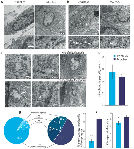 - Borisova, M.A.; Achasova, K.M.; Morozova, K.N.; Andreyeva, E.N.; Litvinova, E.A.; Ogienko, A.A.; Morozova, M.V.; Berkaeva, M.B.; Kiseleva, E.; Kozhevnikova, E.N. Mucin-2 Knockout Is a Model of Intercellular Junction Defects, Mitochondrial Damage and ATP Depletion in the Intestinal Epithelium. Sci. Rep. 2020, 10, 21135. [Google Scholar] [CrossRef]