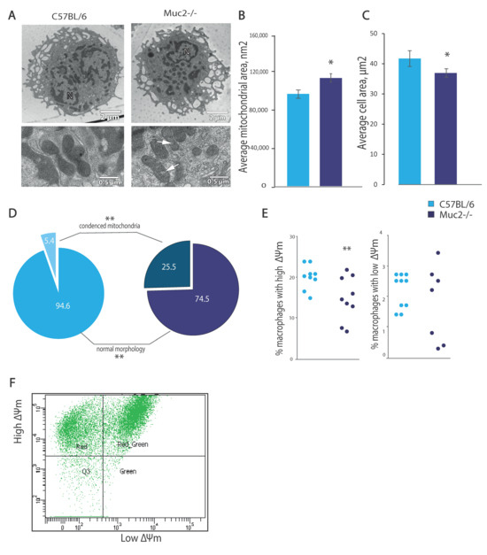 2.2. Mucin-2 Deficiency Affects the Mitochondrial Ultrastructure of the Peritoneal Macrophages and Macrophages in the Lamina Propria, as Well as the Mitochondrial Membrane Potential of the Peritoneal Macrophages