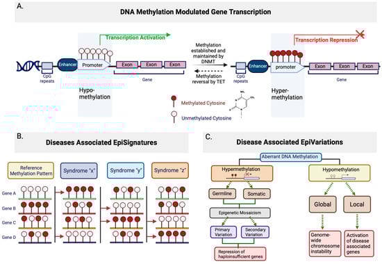 Schematic of DNA methylation modulated gene transcription and associated episignatures and epivariations. (A) General representation of the association between DNA methylation state and gene transcription. Hypomethyaltion in promoter generally leads to transcription activation, where the establishment and maintenance of DNA methylation through DNMT family proteins leads to hypermethylation in the promoter, which represses transcription. The methylation state can be reversed in a process initiated by the TET family proteins. (B) General representation of disease-associated episignatures. Left most represents the reference methylation patterns, with methylated or unmethylated CpGs within a gene. Hypothetical syndromes are shown with red arrows to indicate DNA methylation patterns at specific genes that differ from the reference methylation patterns. (C) General representation of disease-associated epivariations. Aberrant DNA methylation can be either hyper- or hypo-methylation. Hypermethylation can be either germline or somatic, primary or secondary, and ultimately leads to the repression of haploinsufficient genes. Hypomethylation occurs globally (genome-wide) or locally, global hypomethylation leads to chromosomal instability, while local hypomethylation leads to the activation of disease-associated genes.