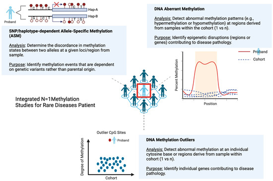 Schematic representation of integrated N = 1 methylation studies for rare disease patients. Possible integrated approaches include SNP/haplotype-dependent Allele-Specific Methylation (ASM), aberrant DNA methylation, and DNA methylation outlier studies. The purpose of the integration is to capture the epigenetic landscape of the proband within a rare disease cohort, which could provide useful insight into rare disease pathology, leading to improved diagnosis and management.