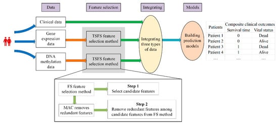 The reliability and performance of predicting clinical outcomes can be improved. Although there have been many papers studying clinical outcomes, they aimed at a single clinical outcome, whereas we studied composite clinical outcomes. Because of the high redundancy of omics data and the two inter-correlated tasks of the survival time and vital status, the combination of feature selection and multi-task learning methods seems to be a good solution to solve the problems of prognostic prediction in neuroblastoma. The overall workflow of this study is shown in Figure 1. It is divided into four steps: data, feature selection, integrating, and models. The major contributions of this study are summarized as follows: (1) we built a framework that predicts a composite clinical outcome of 5-year survival time and vital status for neuroblastoma patients by integrating three types of data, i.e., clinical, gene expression, and DNA methylation data, which improves the reliability and accuracy of the prognostic prediction models; (2) we proposed a two-step feature selection (TSFS) method can quickly and accurately select the available features for developing prediction models; and (3) we identified some reliable markers and employed them to build the survival time and vital status prediction models.