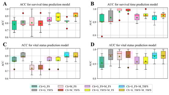 Comparing the classifier performance of each prediction model under eight different types of data. The red circles represent outliers. The green triangles represent the mean of the performance. The red lines represent the median of the performance. (A) ACC for the survival time prediction model; (B) AUC for the survival time prediction model; (C) ACC for the vital status prediction model; (D) AUC for the vital status prediction model. Each panel shows the performance for one of the eight types of data; the box plots show the performance distribution over five test sets.